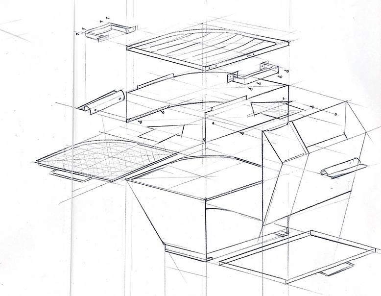Planning the construction of the look-alike prototype by creating a detailed exploded view drawing to clearly visualize each component's assemble. Creating a 1:1 cardboard prototype to determine the dimensions.